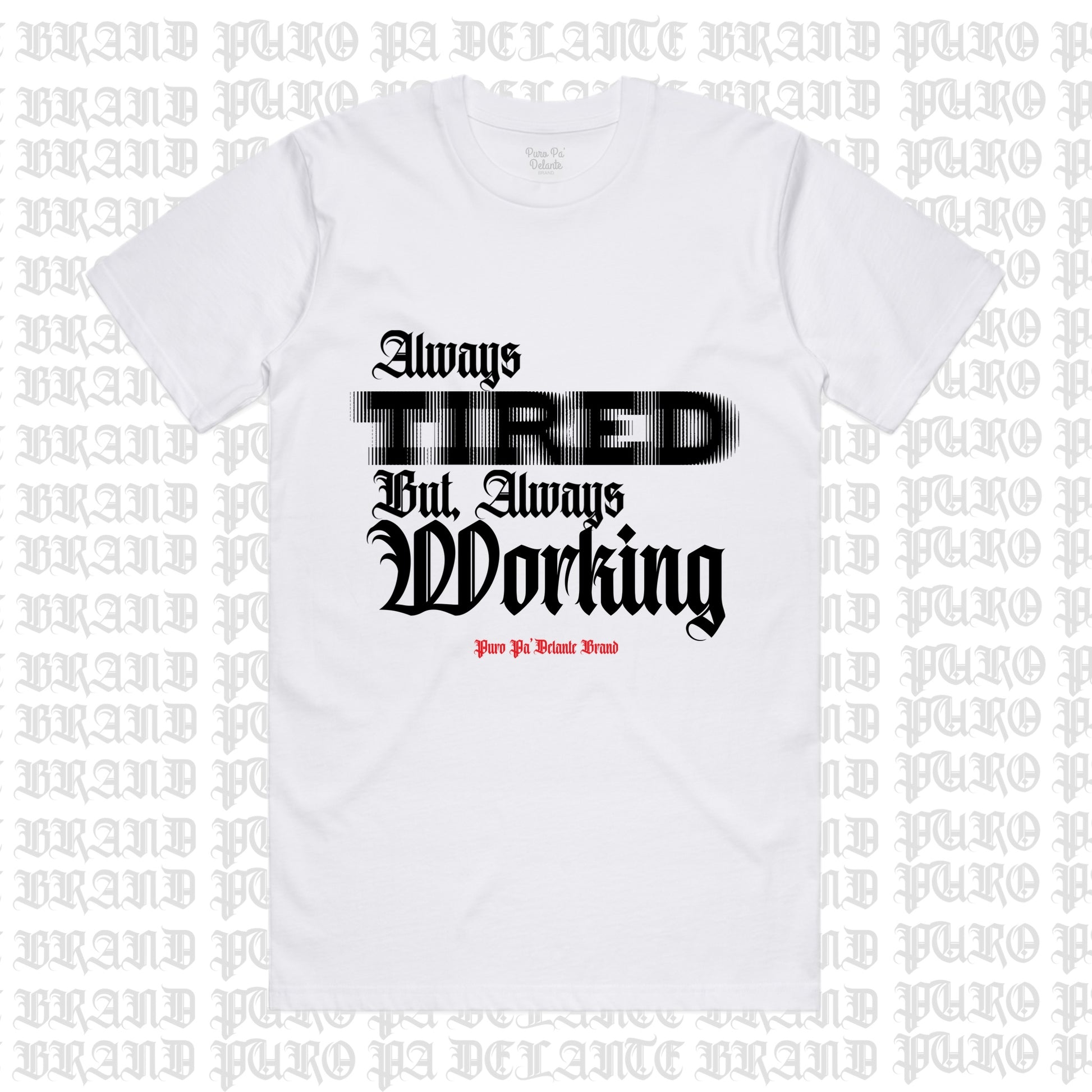 FRONT DESIGN (SCREEN PRINTED) “ALWAYS TIRED BUT, ALWAYS WORKIN ; & PURO PA’ DELANTE BRAND”